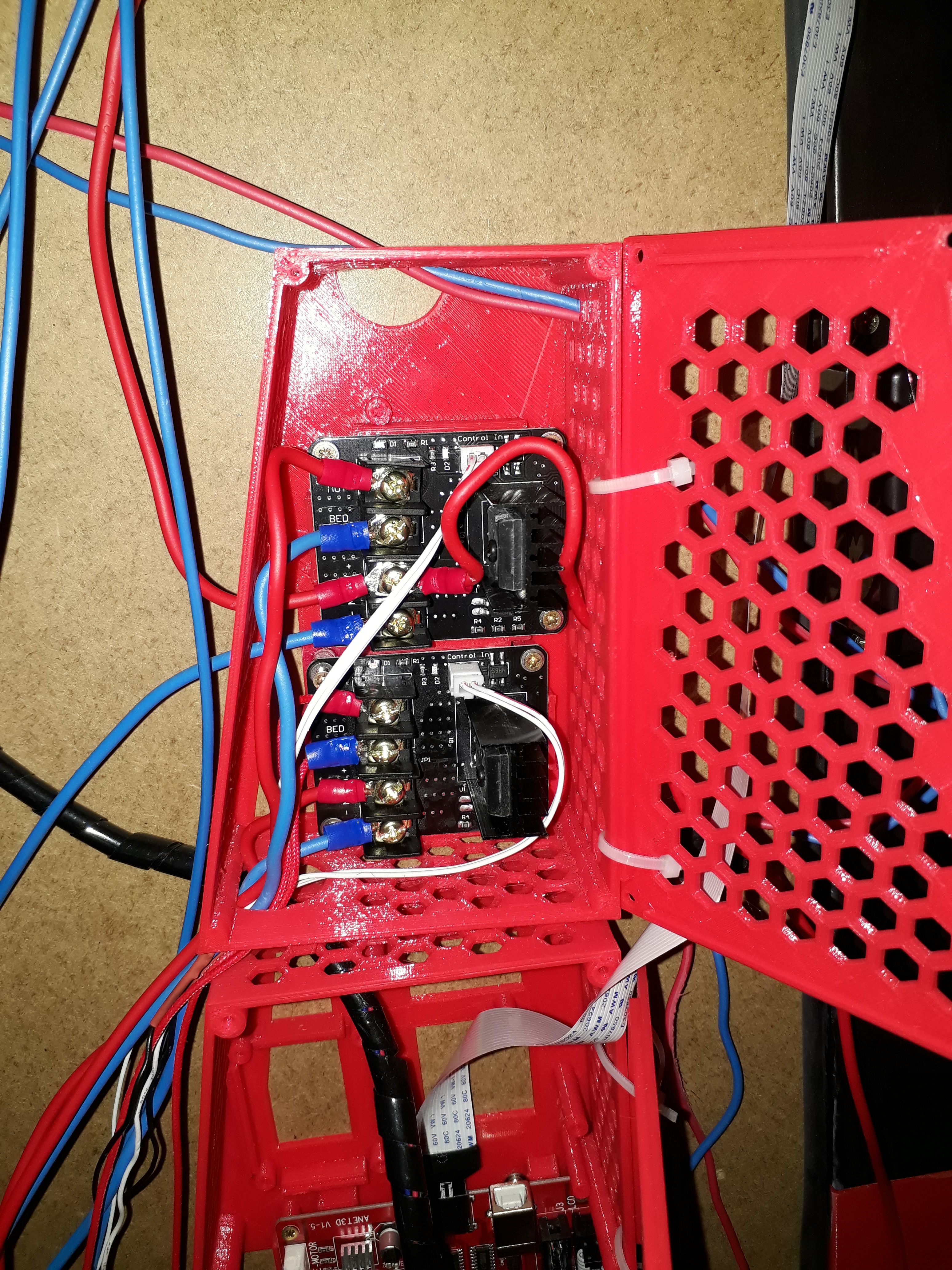 Afin de déporter ma carte mère et d’y mettre un maximum de choses j’ai imprimé un boitier qui permet d’abriter la carte mère de l’Anet ainsi qu’un RaspberryPi / un relais pour le PI / le convertisseur de courant aussi pour le PI / un ventilateur pour refroidir tout ça. Le plan est ici . (Je remplirais ce boitier avec le PI le relais etc dans mon étape 4 d’upgrade)