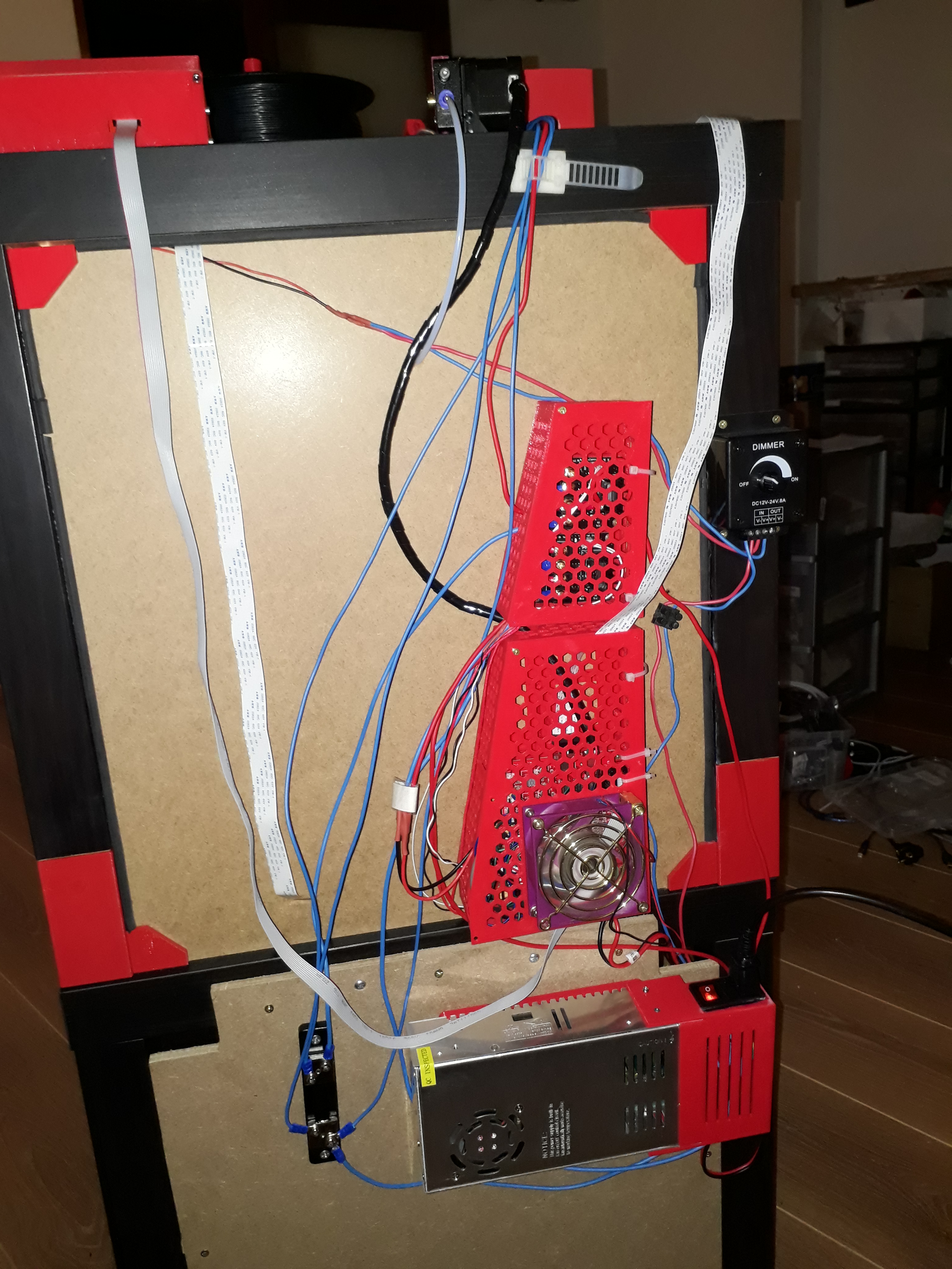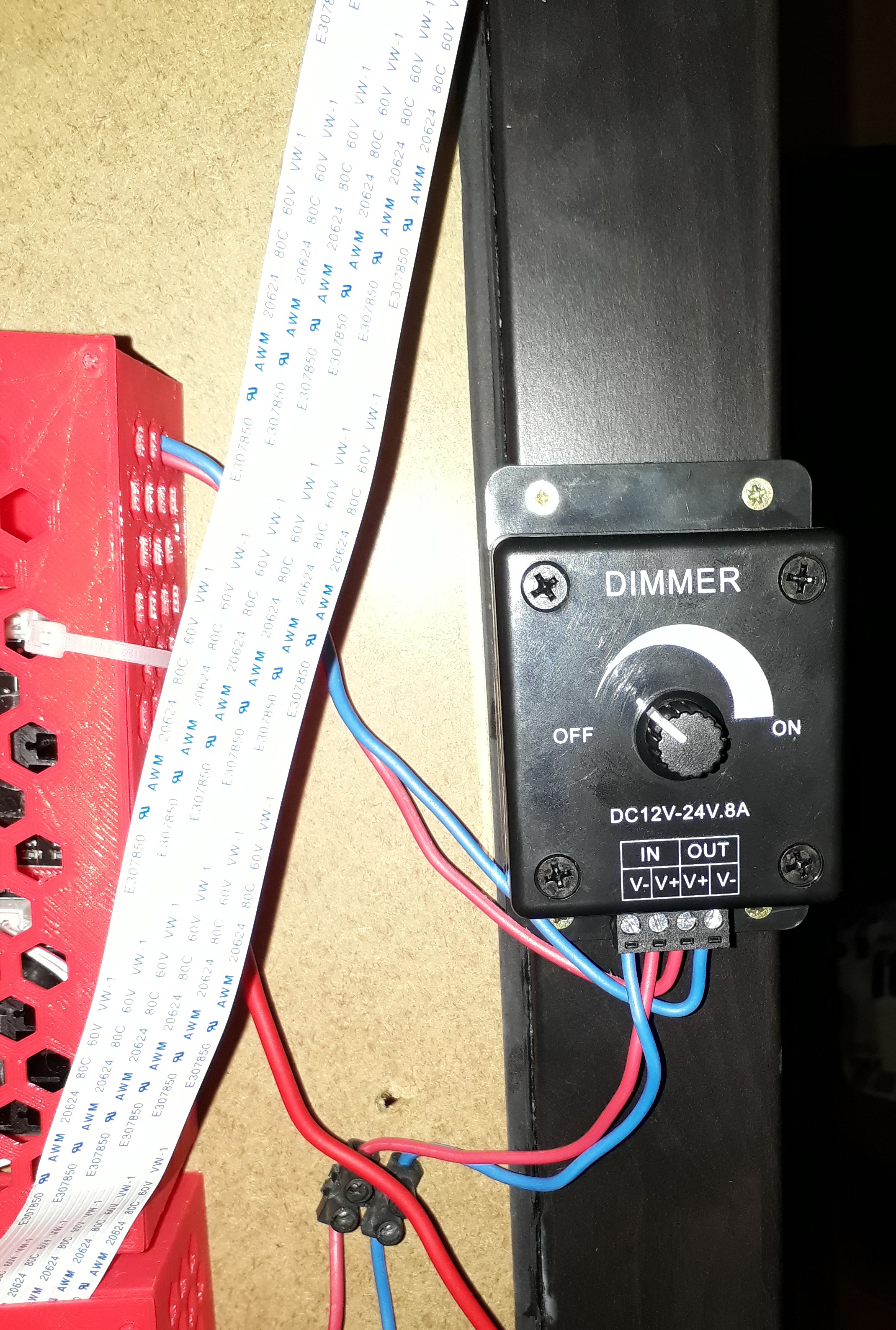 J’ai commencé par créer un caisson autour de mon imprimante qui a pour but de conserver la chaleur dégagée afin qu’elle consomme un peu moins d’énergie et aussi de limiter un peu le bruit qu’elle produit. Pour information le plateau chauffant à lui seul consomme 240W durant la grosse phase de chauffe et descends un peu par la suite (chez moi autour de 190W). J’ai donc commencé par changer d’alimentation (j’ai pris ce modèle sur ebay ) car je souhaite y ajouter un bandeau LED ainsi que quelques autres améliorations tel qu’un Raspberry, un écran de contrôle électrique, des relais, variateur, etc…). J’ai pris ce bandeau LED sur Aliexpress et un variateur de tension pour augmenter / abaisser la puissance du bandeau et je l’ai collé au dessous de la table qui va encadrer l’imprimante (la table du dessus).